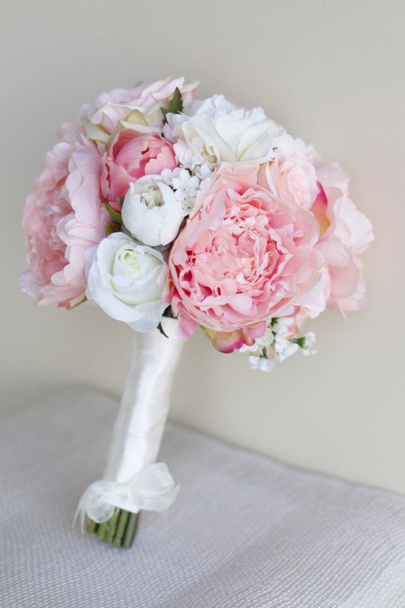 Silk Bride Bouquet Peony Flowers Pink Peach Spring Mix Shabby Chic Wedding Decor by braggingbags