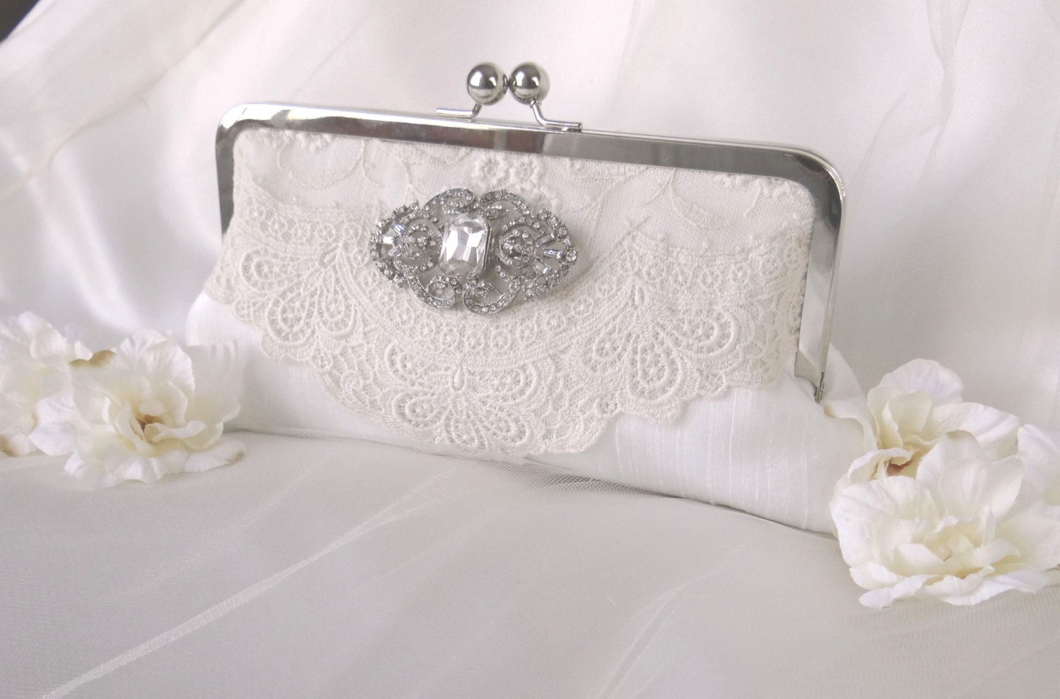 Ready to ship THE ANTIQUE CLUTCH silk with antique lace and rhinestone brooch chain handle add on photo lining