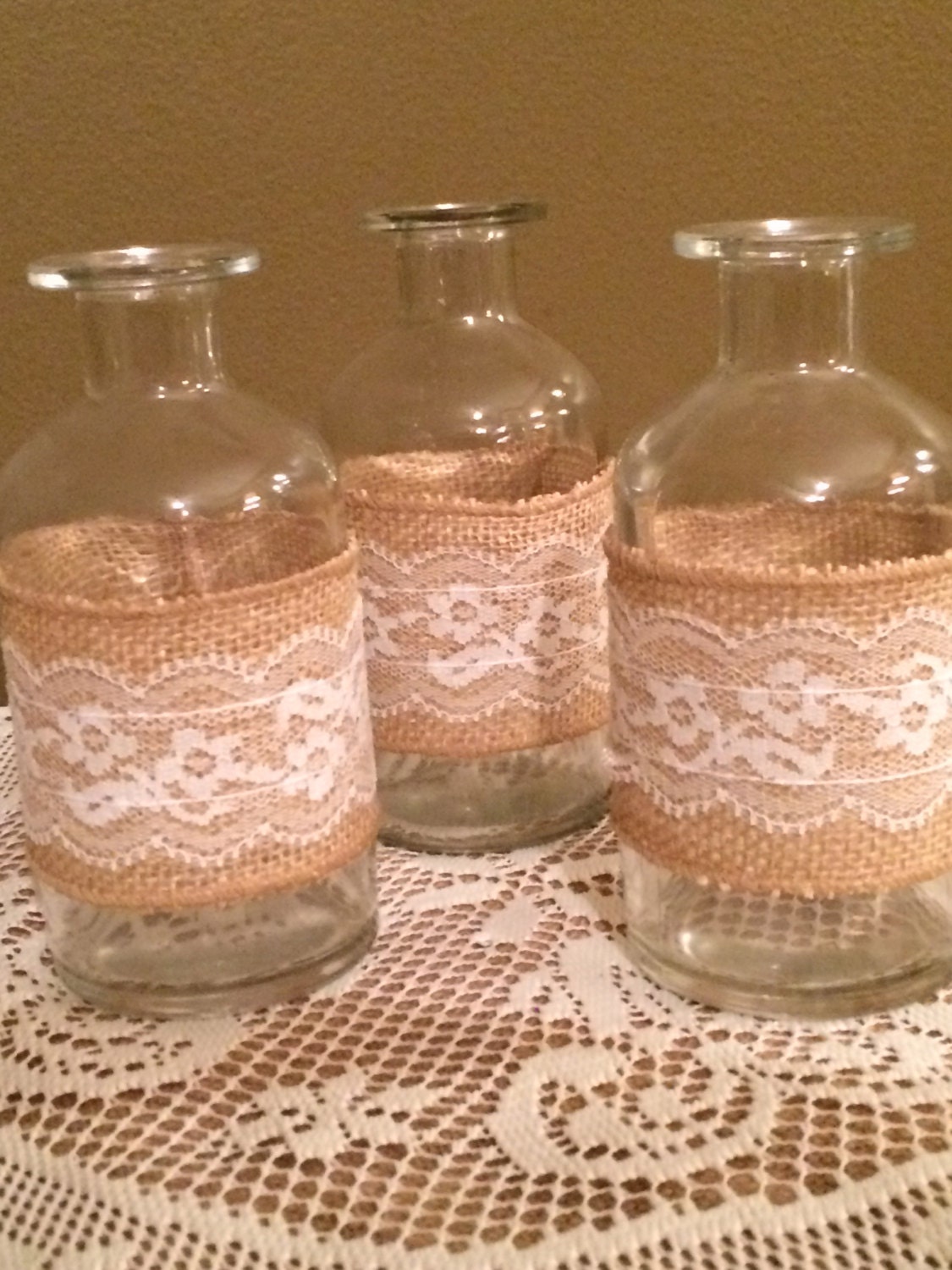 Set of 3 burlap and lace vases, centerpiece vases, rustic wedding decor, burlap and lace