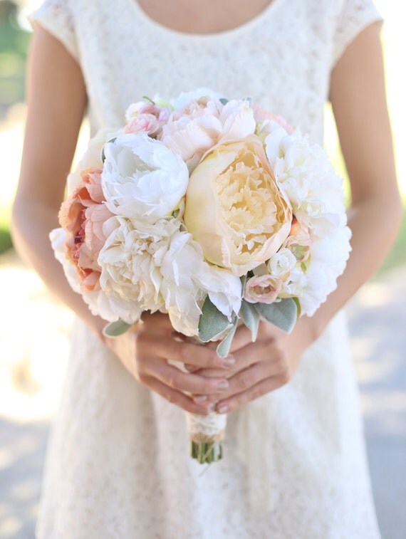 Silk Bride Bouquet Cream and Pale Pink Roses and Peonies Wildflowers Natural Bouquet Shabby Chic Vintage Inspired Rustic Wedding Keepsake by braggingbags